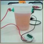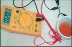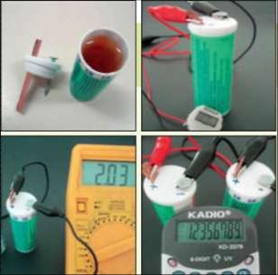 Bakır plakadan 5x4 cm boyutunda bir şerit kesin. 5x1 cm’lik bir çubuk elde edene kadar iki kez ortadan katlayın ve penseyle ezin (sonunda dört kat olacak). Plastik içecek bardağının üste yakın kenarına maket bıçağıyla bir yarık açın, bakır çubuğu geçirin, bardağın içine doğru bükün (tutturmak için oyun hamuru kullanabilirsiniz). Bakır çubuğun karşısına çiviyi geçirin (unutmayın galvanize çivi olacak). Bakır çubuğa kırmızı timsah ağızlı kabloyu, çiviye de siyah timsah ağızlı kabloyu tutturun. Multimetreyi voltmetre pozisyonuna getirin (DC) ve bakır çubukla çivinin arasındaki gerilimi ölçün. Biz 1 volt kadar ölçtük!
